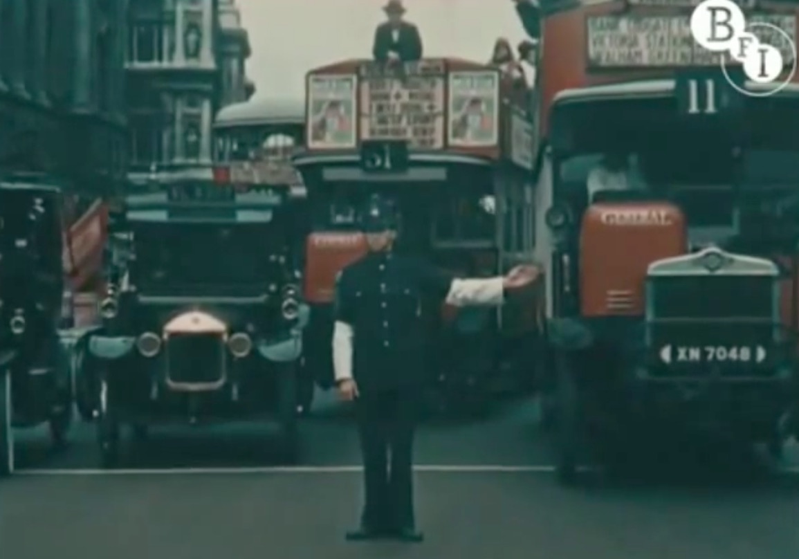 A frame from "The Open Road" shows everyday city life. Red buses, elegant cars, and bustling streets – all of this formed the backdrop for the historic chess battles.