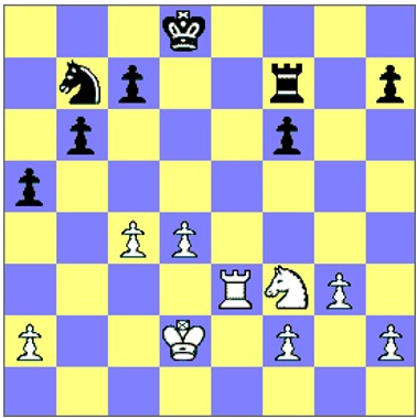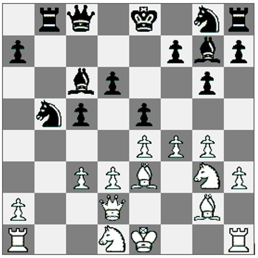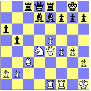 1.e4 c5 2.Nc3 Nc6 3.g3 g6 4.Bg2 Bg7 5.d3 d6 6.Nge2 Bd7 7.Be3 Nd4 8.h3 Qc8 9.Qd2 Rb8 10.g4 b5 11.Ng3 b4 12.Nd1 Bc6 13.c3 bc3 14.bc3 Nb5 15.f4 e5? (The cause of Black's further troubles. Correct was 15...Na3!)